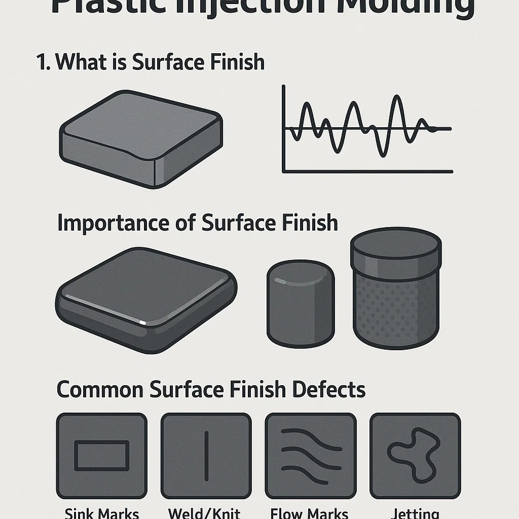 - Pamantayan sa industriya: Ang plastics industry often uses the SPI (Society of the Plastics Industry) Pag -uuri ng Surface Tapos na , na saklaw mula sa salamin (A-grades) hanggang sa matte/mapurol (D-grade). Ang pagtukoy ng isang grade ng SPI ay karaniwang kasanayan kapag nagdidisenyo ng isang amag.