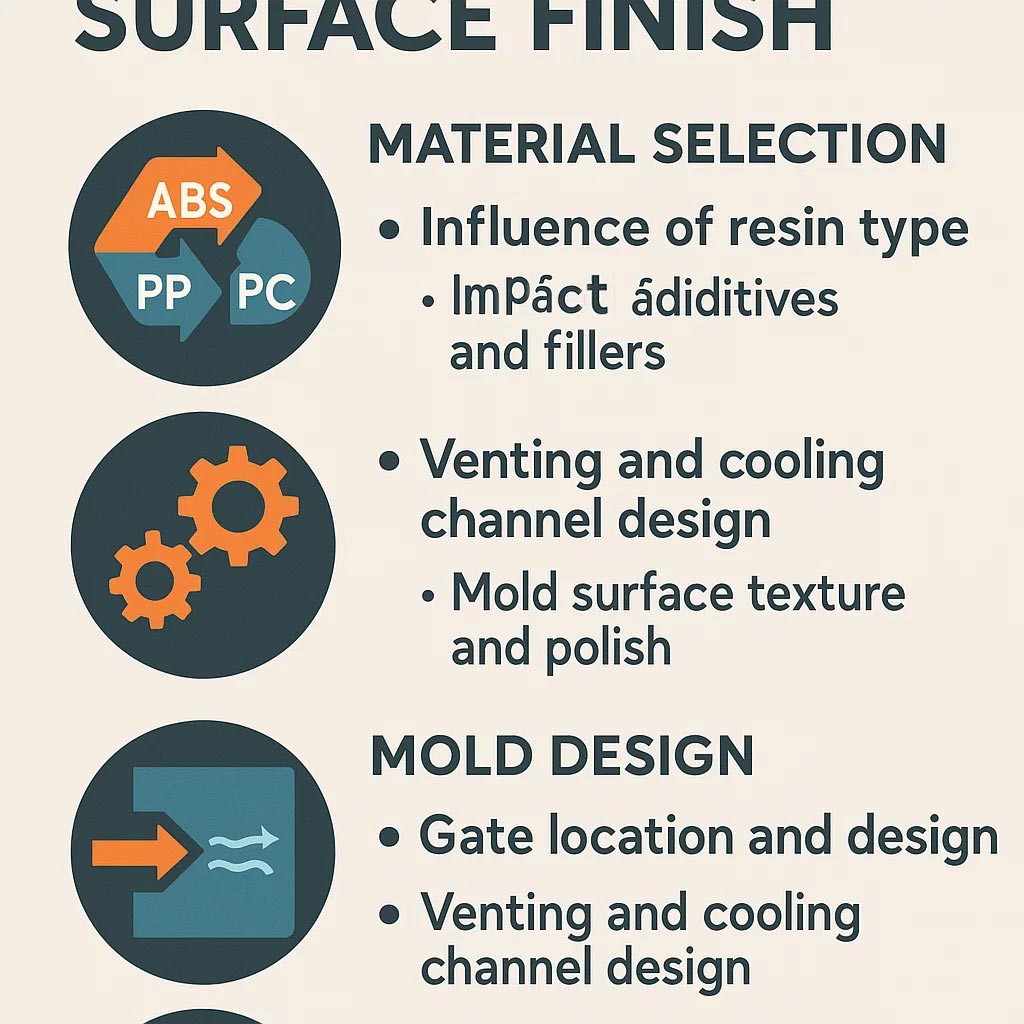 - Katumpakan ng tooling: Ang mold dictates the maximum achievable finish. Investing in appropriate bolishing ng amag (sa isang tiyak na r a halaga o Grade grade ) o pag-aaplay ng high-precision Surface Texturing (kemikal o laser) ay mahalaga. Wasto Venting at uniform Paglamig ng disenyo ng channel ay hindi maaaring makipag-usap para maiwasan ang mga depekto.