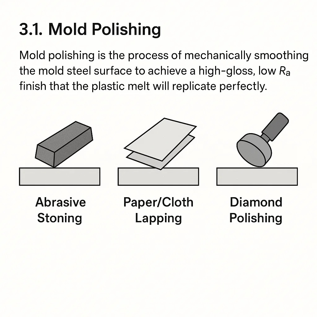 - Bolishing ng amag: Ang pag-polish ng katumpakan gamit ang brilyante na i-paste o nakasasakit na mga bato ay kinakailangan para sa mga bahagi ng mirror-finish (SPI A-grades).