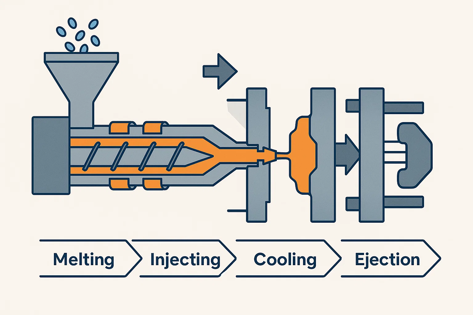 Paano ito gumagana: natutunaw, pag -iniksyon, paglamig, at ejection