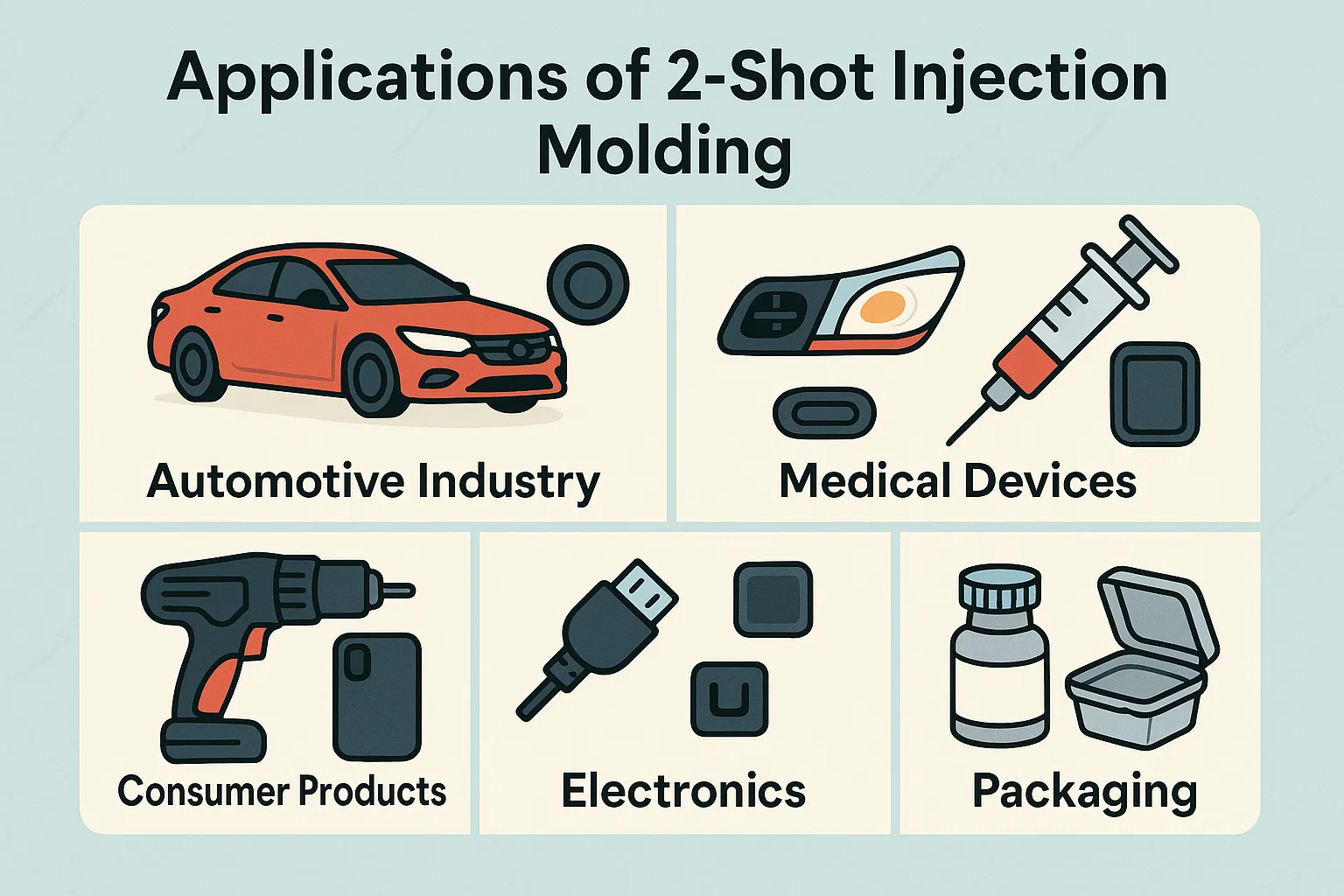 Ang sektor ng automotiko ay lubos na umaasa sa 2-shot na paghuhulma para sa parehong mga panloob at panlabas na mga sangkap. Ginagamit ito upang lumikha ng mga bahagi na parehong matibay at tactile.