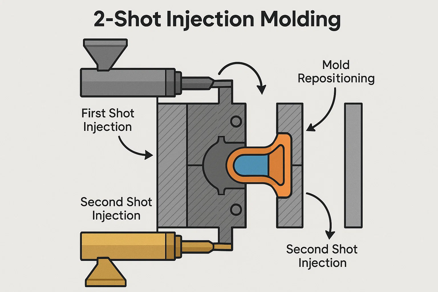 Sa coe nito, 2-shot injection molding (Kilala rin bilang dalawang-shot na paghuhulma) ay isang lubos na dalubhasang proseso ng pagmamanupaktura na gumagawa ng isang solong, tapos na sangkap mula sa dalawang magkakaibang mga materyales sa isang solong, patuloy na pag-ikot ng paghubog. Hindi tulad ng mga tradisyonal na pamamaraan kung saan maraming mga bahagi ang nahuhubog nang hiwalay at pagkatapos ay tipunin, ang 2-shot na paghuhulma ay pinagsasama ang mga hakbang na ito sa isang mahusay na operasyon. Ang prosesong ito ay nakatulong sa paglikha ng mga bahagi na may kumplikadong mga geometry, Pinagsamang selyo, multi-colo aesthetics, at pinahusay na pag-andar nang hindi nangangailangan ng pangalawang pagpupulong.