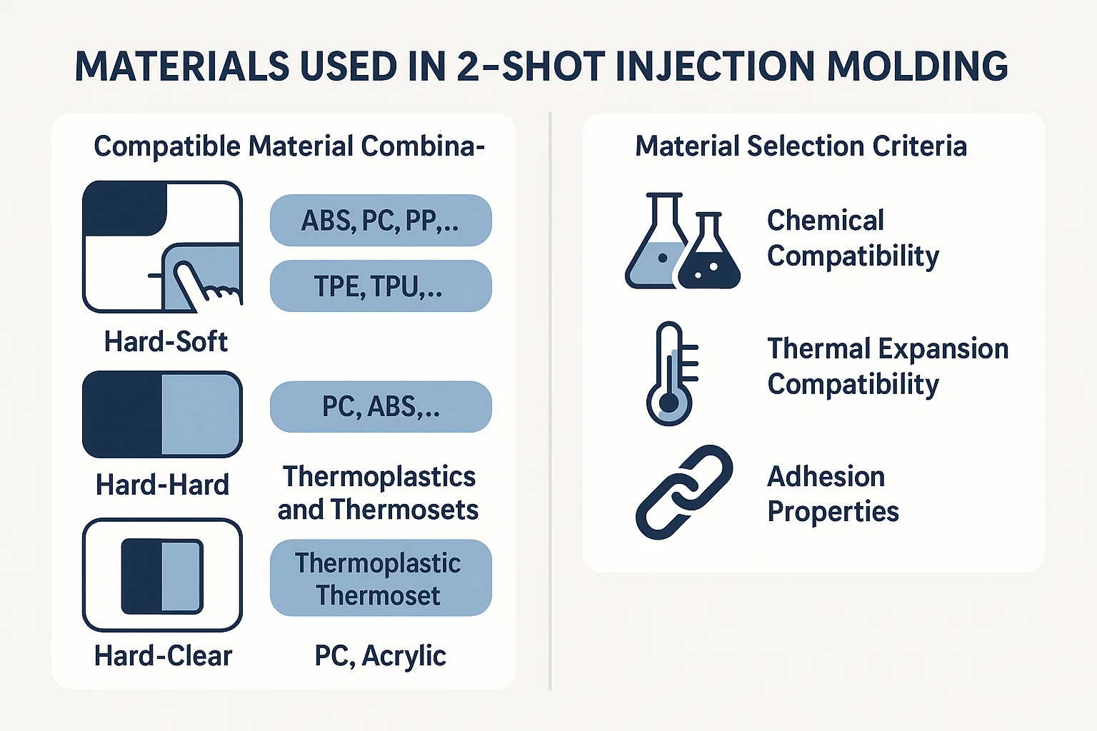 Ang tagumpay ng anumang 2-shot injection molding project ay nakasalalay sa maingat na pagpili ng mga materyales. Ang dalawang polimer ay hindi lamang dapat matugunan ang mga kinakailangan at aesthetic na mga kinakailangan ng pangwakas na produkto ngunit maging katugma din sa bawat isa upang makabuo ng isang malakas, pangmatagalang bono. Ang seksyon na ito ay galugarin ang mga uri ng mga materyal na kumbinasyon at ang kritikal na pamantayan para sa pagpili sa kanila.