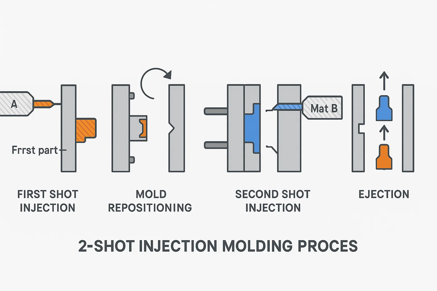 Ang pangunahing prinsipyo ng 2-shot injection molding ay ang sunud-sunod na iniksyon ng dalawang materyales sa isang espesyal na dinisenyo na amag. Ang proseso sa pangkalahatan ay sumusunod sa mga pangunahing hakbang na ito: