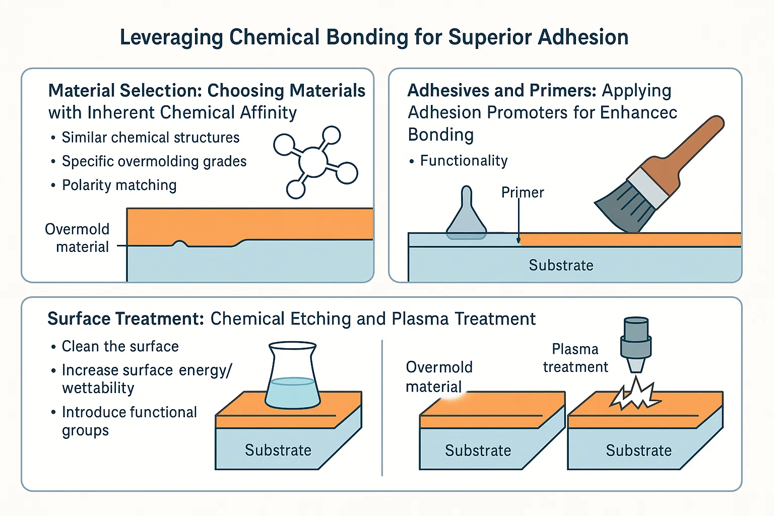 Kahit na sa mga materyales na katugmang kemikal, ang mga kontaminadong ibabaw o mababang enerhiya sa ibabaw ay maaaring makahadlang sa bonding. Ang iba't ibang mga paggamot sa ibabaw ay maaaring maghanda ng substrate upang maging mas kaakit -akit sa pakikipag -ugnay sa kemikal.
