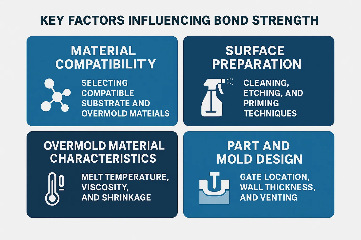 Ang pagkamit ng isang mahusay na bono sa overmolding ay hindi lamang tungkol sa pag -unawa sa agham; Ito ay tungkol sa meticulously na kinokontrol ang ilang mga praktikal na kadahilanan sa buong proseso ng disenyo at pagmamanupaktura. Ang pagpapabaya sa alinman sa mga ito ay maaaring makabuluhang ikompromiso ang pangwakas na lakas ng bono.