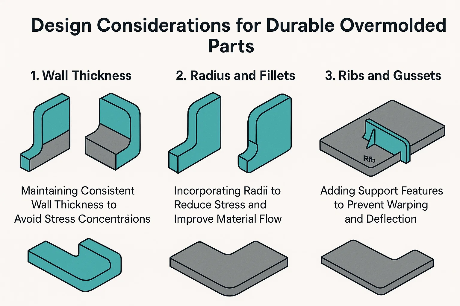 Tip sa Disenyo: Kapag nagdidisenyo ng mga buto-buto para sa mga overmolded na bahagi, tiyakin na ang kanilang kapal ay isang porsyento (karaniwang 40-60%) ng kapal ng nominal na pader upang maiwasan ang mga marka ng lababo sa kosmetikong bahagi. Gayundin, tiyakin na mayroon silang wastong mga anggulo ng draft para sa madaling pag -ejection ng amag.
