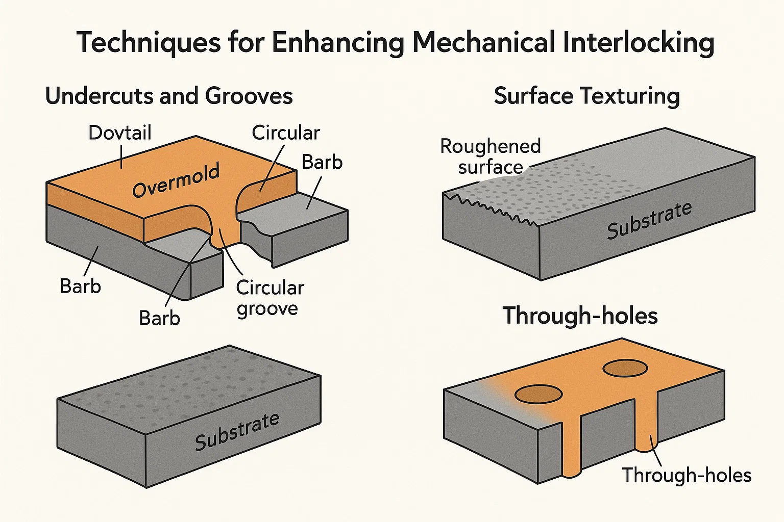 Mag -isip ng mga undercuts at grooves bilang mikroskopikong kawit o mga angkla sa loob ng substrate. Kapag ang tinunaw na overmold na materyal ay dumadaloy sa mga tampok na ito at lumalamig, pinapatibay nito sa paligid nila, na lumilikha ng isang pisikal na lock.