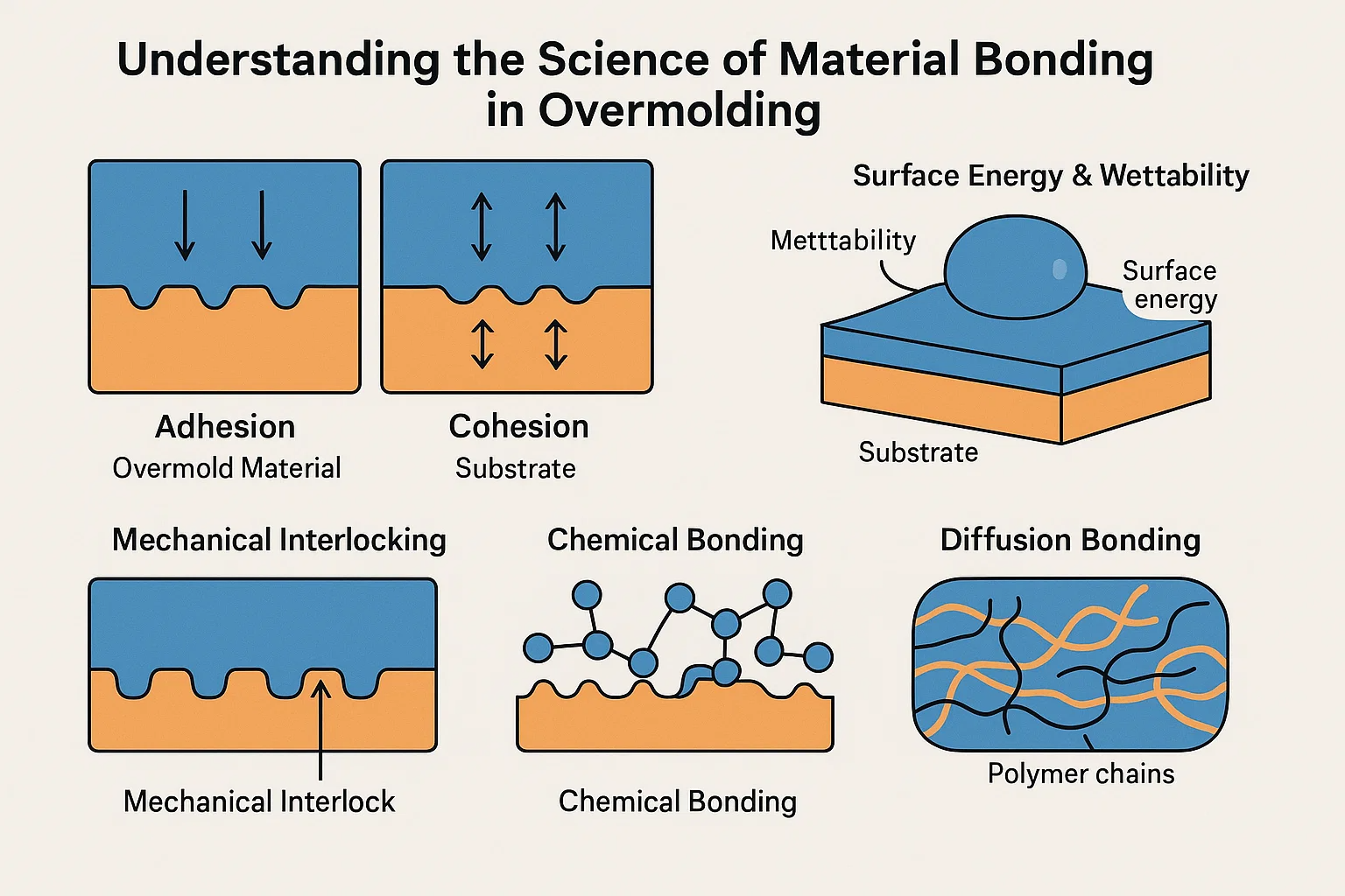 Ang pagkamit ng isang permanenteng bono sa overmolding ay hindi mahika; Ito ay isang agham na nakaugat sa kung paano nakikipag -ugnay ang mga materyales sa isang antas ng mikroskopiko. Upang tunay na master overmolding, kailangan nating maunawaan ang pangunahing mga prinsipyo ng pagdirikit at Cohesion , at kung paano ito nalalapat sa interface sa pagitan ng iyong substrate at overmold na materyal.