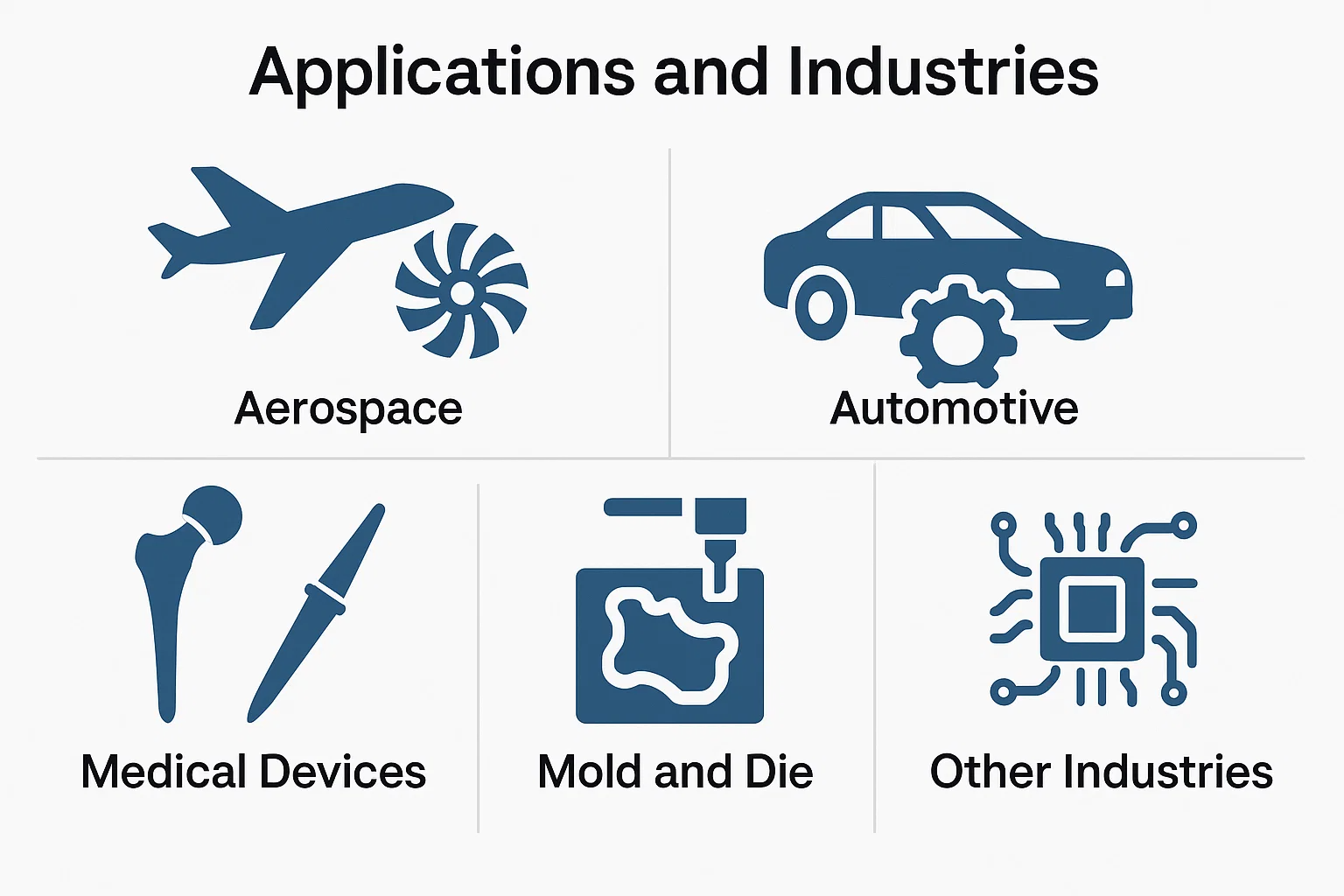 Dahil sa mga advanced na kakayahan nito, ang 5-axis CNC machining ay kailangang-kailangan sa mga industriya na humihiling ng pinakamataas na antas ng katumpakan at pagiging kumplikado ng geometric. Ang mga aplikasyon nito ay sumasaklaw sa isang malawak na saklaw: