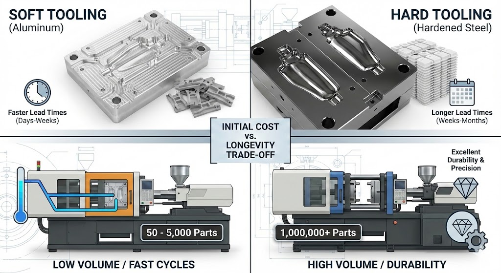 Ang industriya ay karaniwang naghahati sa paggawa ng amag sa dalawang kategoya: Malambot na tooling at Hard tooling . Habang ang mga pangalan ay nagpapahiwatig ng pagkakaiba -iba sa pisikal na texture, ang pagkakaiba ay talagang namamalagi sa metalurhiya ng materyal ng amag, bilis ng machining, at kahabaan ng buhay.