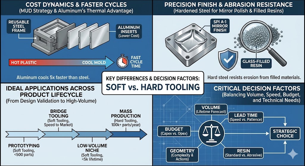 - Malambot na tooling Advantage: Ang aluminyo ay may makabuluhang mas mataas na thermal conductivity kaysa sa bakal. Ito ay kumukuha ng init sa labas ng plastik nang mas mabilis, na pinapayagan ang bahagi na palakasin ang mas mabilis. Para sa isang run run ng 5,000 bahagi, ang mas mabilis na oras ng pag -ikot ng isang tool ng aluminyo ay maaaring minsan ay mai -offset ang mas mataas na paunang gastos kumpara sa isang napaka -murang tool na bakal.