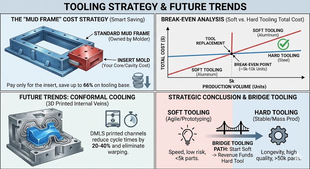 Kung hindi ka sigurado, tanungin ang iyong kasosyo sa pagmamanupaktura tungkol sa a "Bridge Tooling" diskarte. Magsimula sa isang tool na murang aluminyo upang mabilis na makarating sa merkado. Gumamit ng kita mula sa mga unang 5,000 bahagi upang pondohan ang pagtatayo ng permanenteng P20 na hulma ng bakal. Nagbibigay ito sa iyo ng bilis ng malambot na tooling na may kahabaan ng kahabaan ng matigas na tooling.