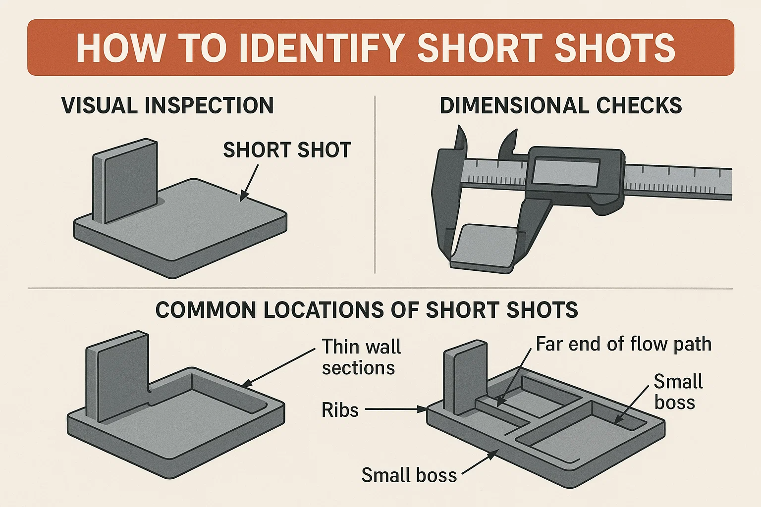 Ang mga maikling shot halos palaging nangyayari sa dulo ng landas ng daloy , na kung saan ay ang punto na pinakamalayo mula sa gate kung saan ang plastik ay pumapasok sa lukab. Ang tinunaw na plastik ay nawawala ang init at presyon habang naglalakbay, kaya ang mga huling lugar upang punan ang pinaka -madaling kapitan ng isang maikling pagbaril. Ang mga lugar na ito ay madalas: